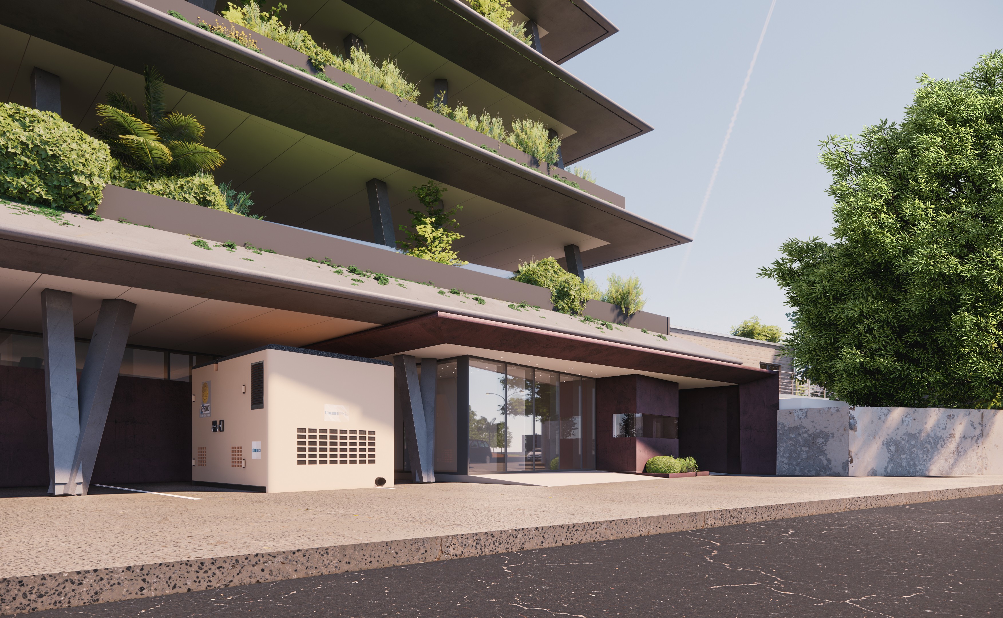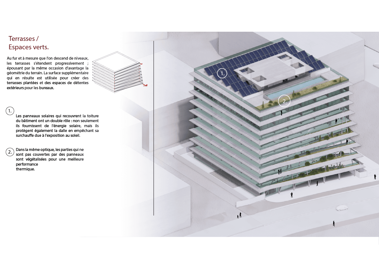 Geometric Adaptation: As the building levels descend, the floor plates gradually expand to align with the site’s geometry. This staggered approach creates a series of landscaped terraces, providing office users with integrated outdoor relaxation spaces and deep shading for the floors below. Dual-Purpose Solar Roof (1): The roof-mounted solar panels serve a double function: generating renewable energy while acting as a thermal shield that prevents the building’s slab from overheating. Thermal Performance & Vegetation (2): Complementing the solar array, the remaining roof areas are fully vegetated. This green layer enhances the building's overall thermal performance, reducing heat absorption and contributing to a healthier microclimate within the urban context.