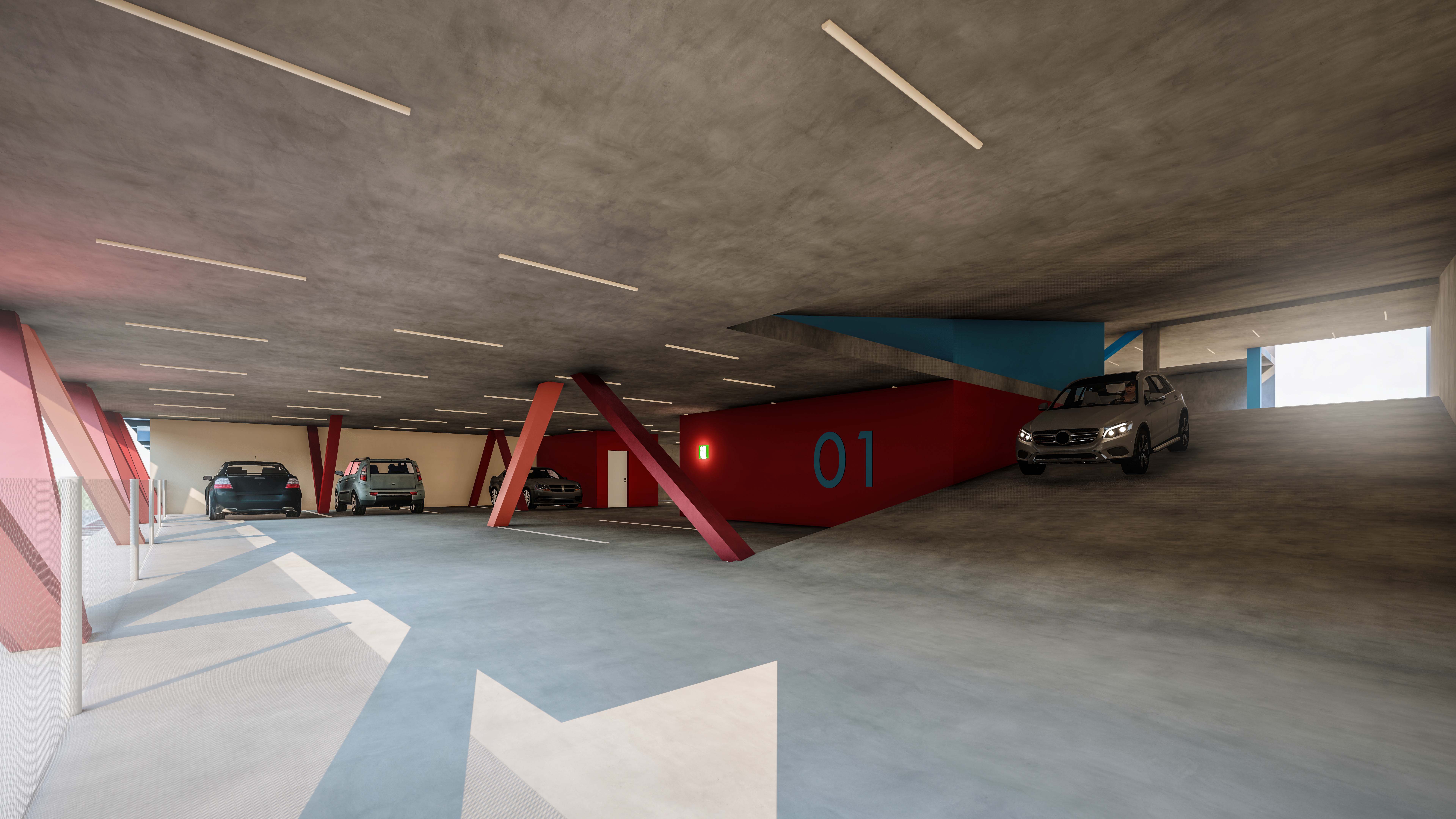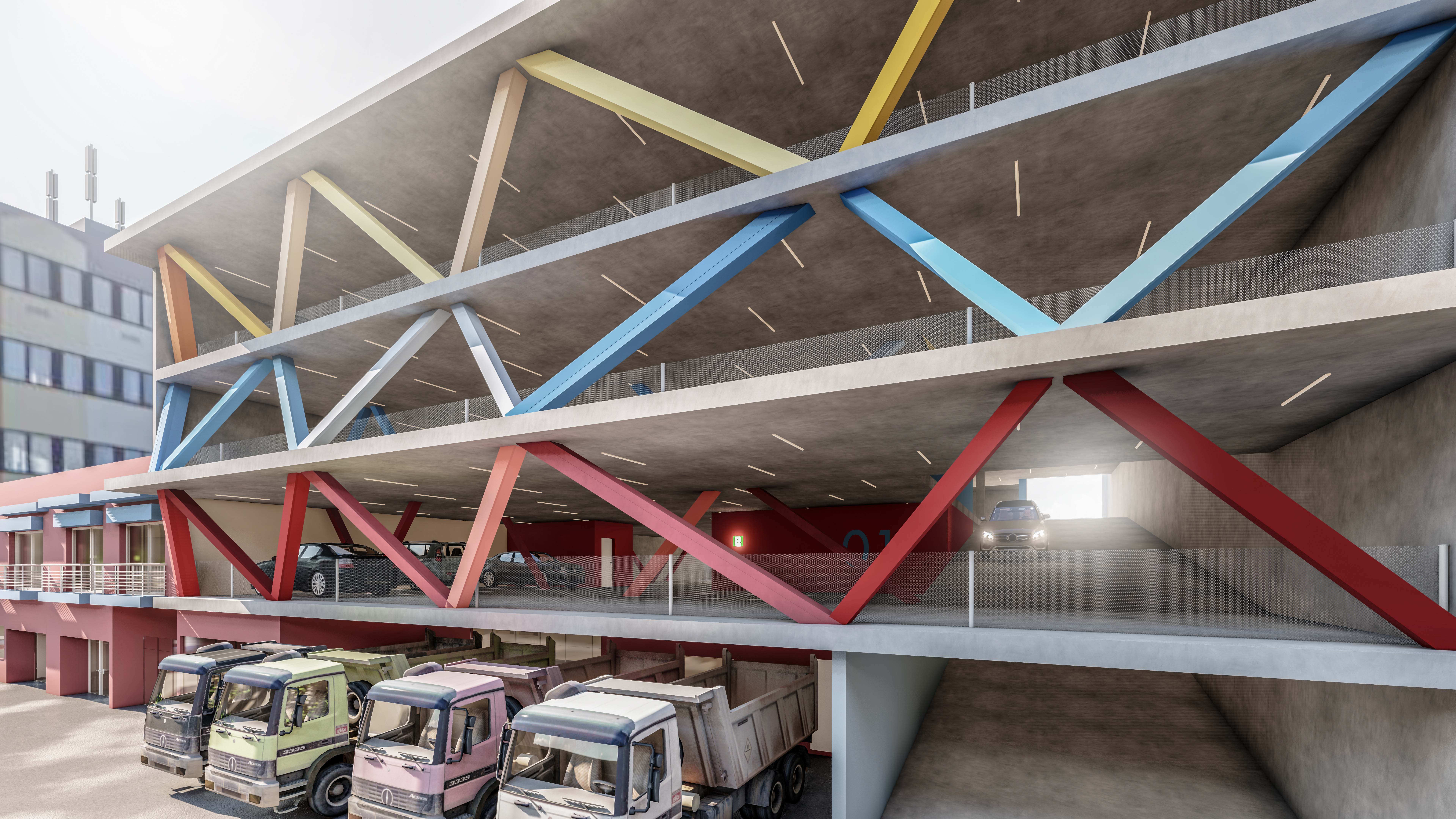 These structural V-shapes are painted in vibrant, primary colors (red, blue, yellow), creating a stark, kinetic contrast against the raw, brutalist grey concrete. This chromatic rhythm breaks down the massive scale of the building, transforming a static parking structure into an active, geometric landmark that animates the streetscape.