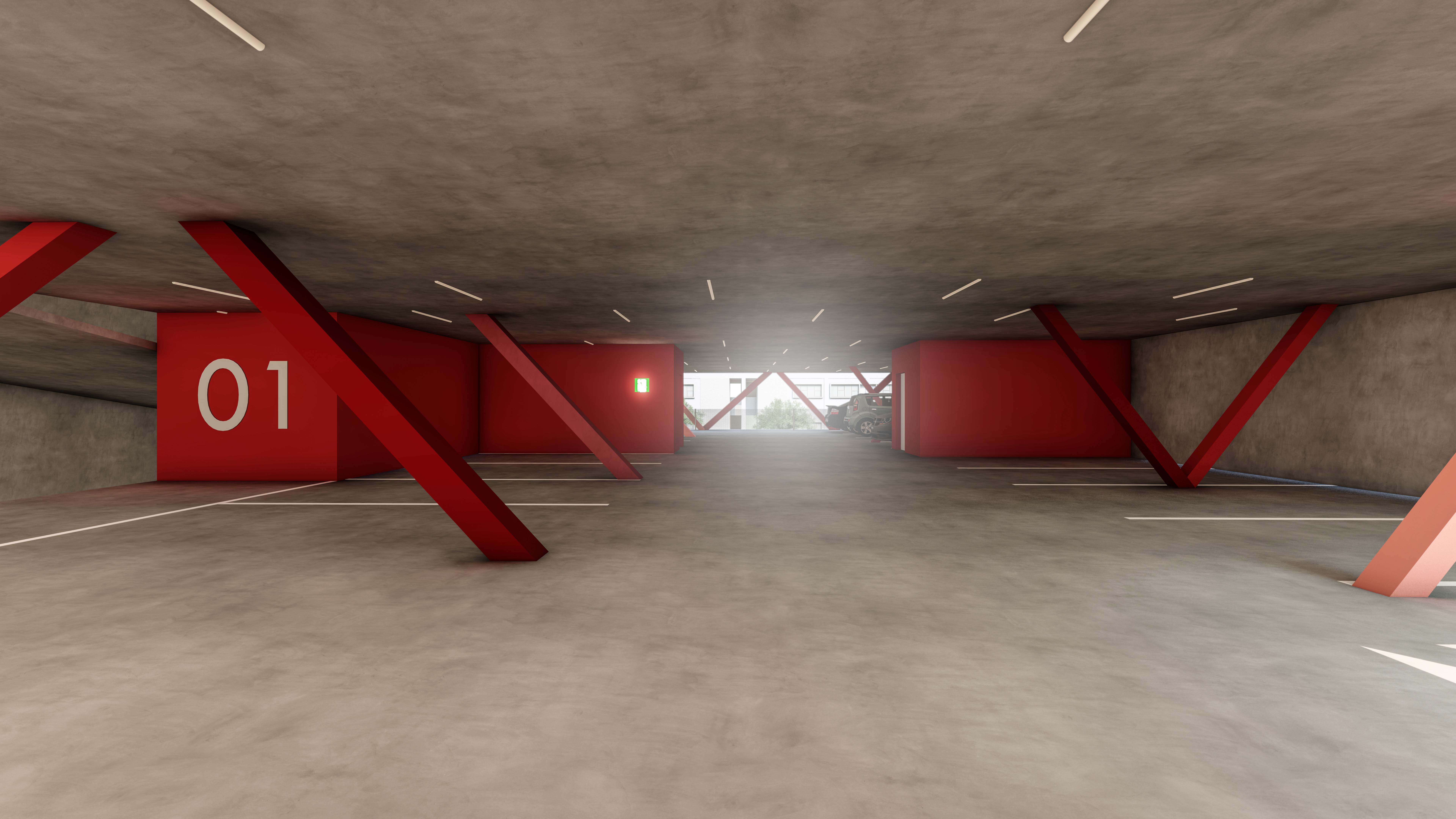 The defining feature of the building is its striking structural exoskeleton. To support the open-span concrete slabs, we implemented a series of heavy diagonal bracing columns across the facade.