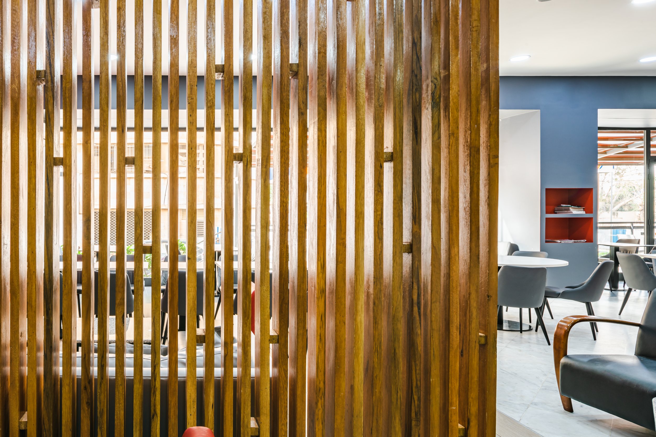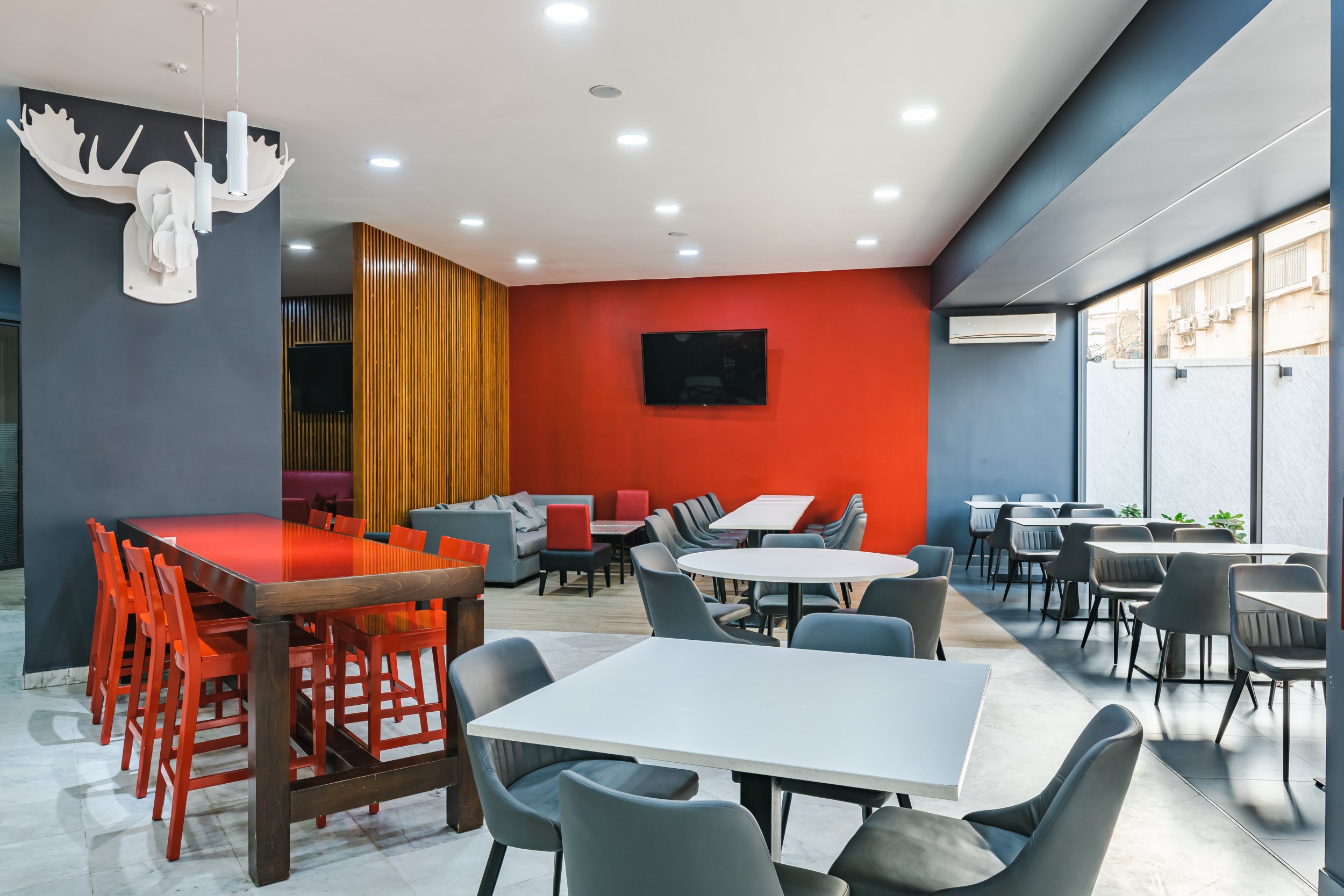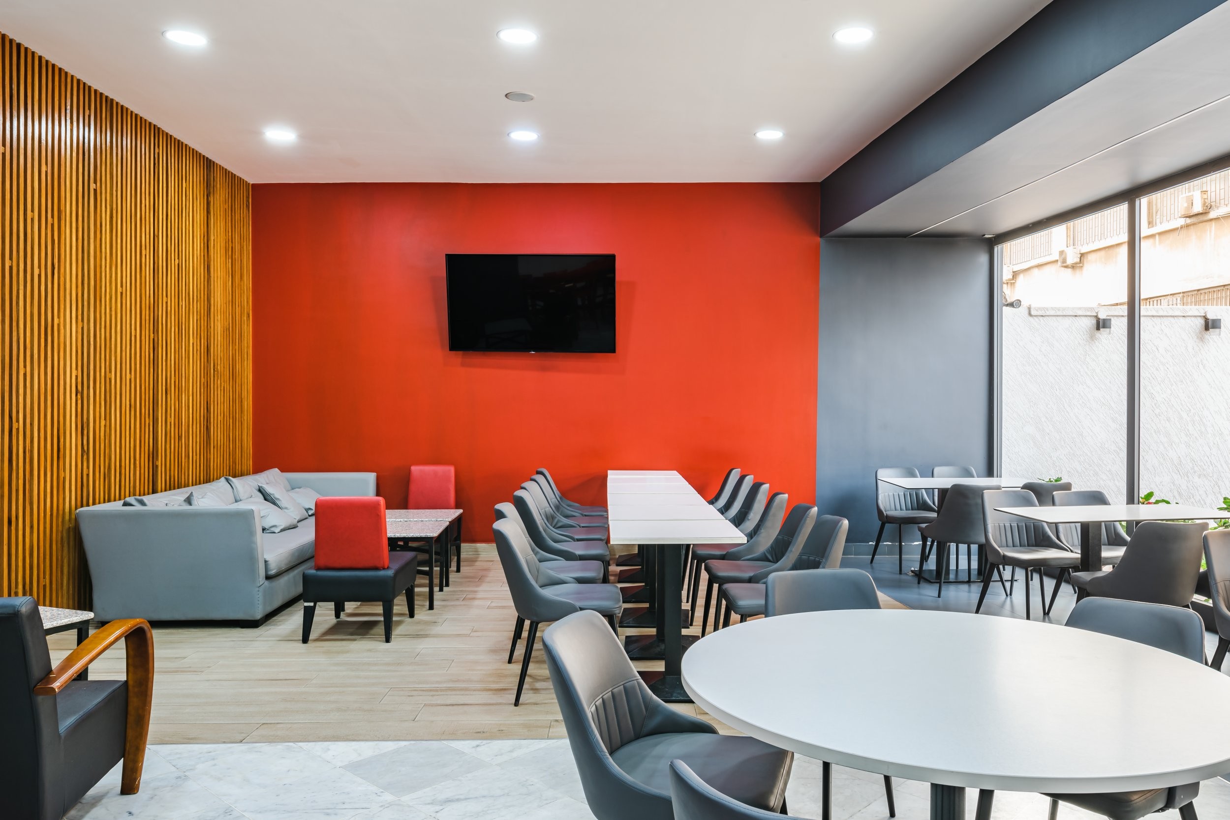 The combination of warm tones of red and gray with light white and wood creates both a vibrant and inviting atmosphere, perfect for relaxation.